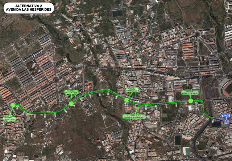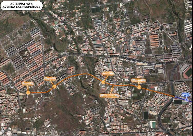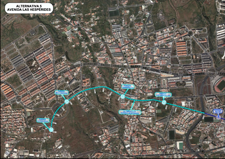 Por otro lado las alternativas 4 y 5 arrancan desde la parada de Tíncer y continúan en línea recta por la Calle Las Loas para conectar con la avenida de las Hespérides, contemplando una vía nueva sobre la que discurriría este trazado.
