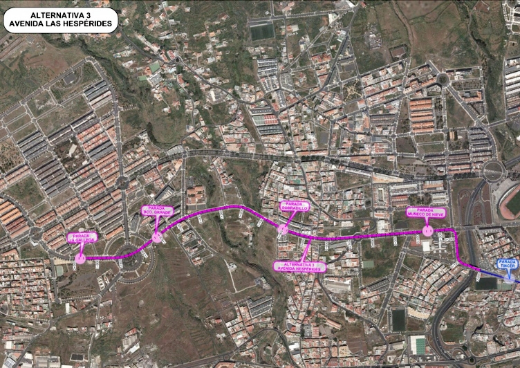 El mismo trazado ofrece también cinco alternativas por Hespérides y una por Los Majuelos. Las tres primeras alternativas comparten el inicio del trazado, subiendo por la calle El Terrero para enlazar y circular por la avenida Hesperides.
