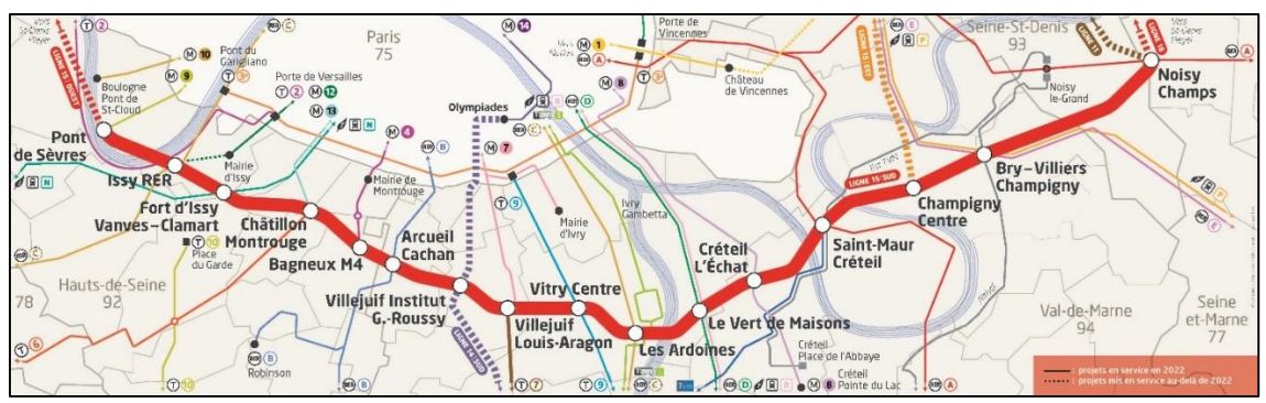 La línea 15 Sur, completamente subterránea tendrá dieciséis estaciones y correspondencia con todas las líneas de metro, tranvía y RER además de cruzar las otras líneas del Grand Paris Express.