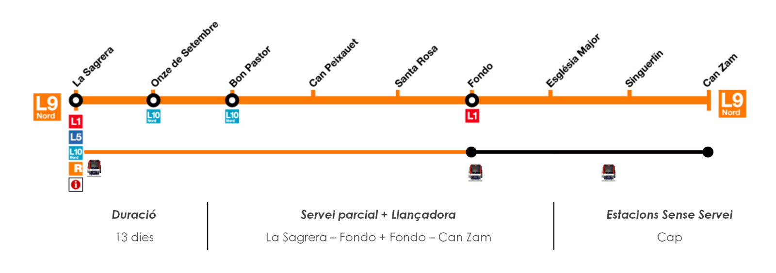 La estación Fondo de la línea 9 Norte del metro de Barcelona afrontará entre el 7 y el 19 de abril una actuación destinada a reparar aparatos de vía, para la que no será necesario cortar el servicio. Los usuarios sólo tendrán que cambiar de tren o andén al llegar a Fondo para continuar su trayecto hasta Can Zam en un sentido o La Sagrera en el otro.