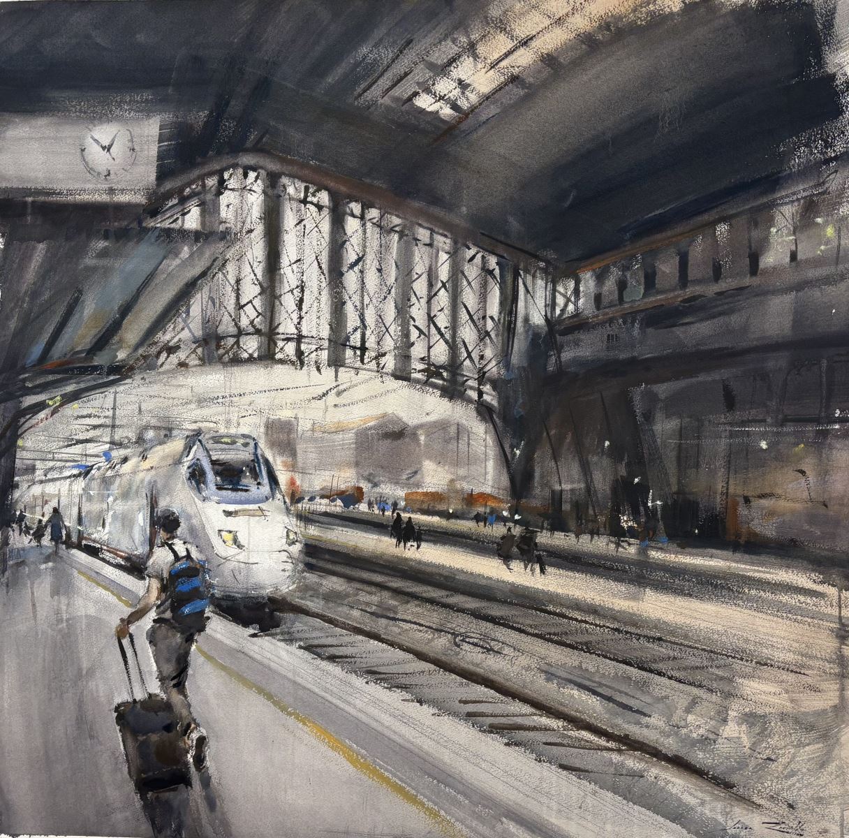 Su obra respira luz, pero también sombras suaves. Como si cada trazo, ágil y deliberado, estuviera filtrado por una acuarela en tonos negros. El ferrocarril es elevado a un homenaje visual, donde el pintor se recrea en los matices, en el balance tonal, en los contornos y claroscuros, no solo para representar lo que ve, sino para reinterpretarlo.