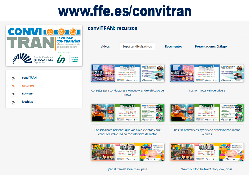 La Fundación de los Ferrocarriles Españoles presenta nuevos materiales del proyecto ‘conviTRAN - Modelo de convivencia de movilidad segura: la ciudad con tranvías’. Son tres documentos divulgativos concebidos para distintos grupos sociales y encaminados a potenciar espacios seguros en torno a los tranvías disponibles, que se encuentran ya en la web del proyecto, desde donde se pueden descargar.
