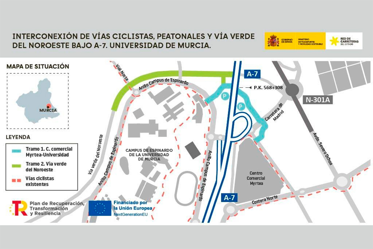 El Ministerio de Transportes y Movilidad Sostenible a través de la Dirección General de Carreteras, ha puesto en servicio la interconexión de las vías ciclistas y peatonales y el Camino Natural Vía Verde del Noroeste, a su paso bajo la autovía A-7 (anteriormente denominada A-30), en el entorno de la Universidad de Murcia. Las obras han sido financiadas con una inversión de 1,5 millones de euros de los fondos europeos del Plan de Recuperación, Transformación y Resiliencia.