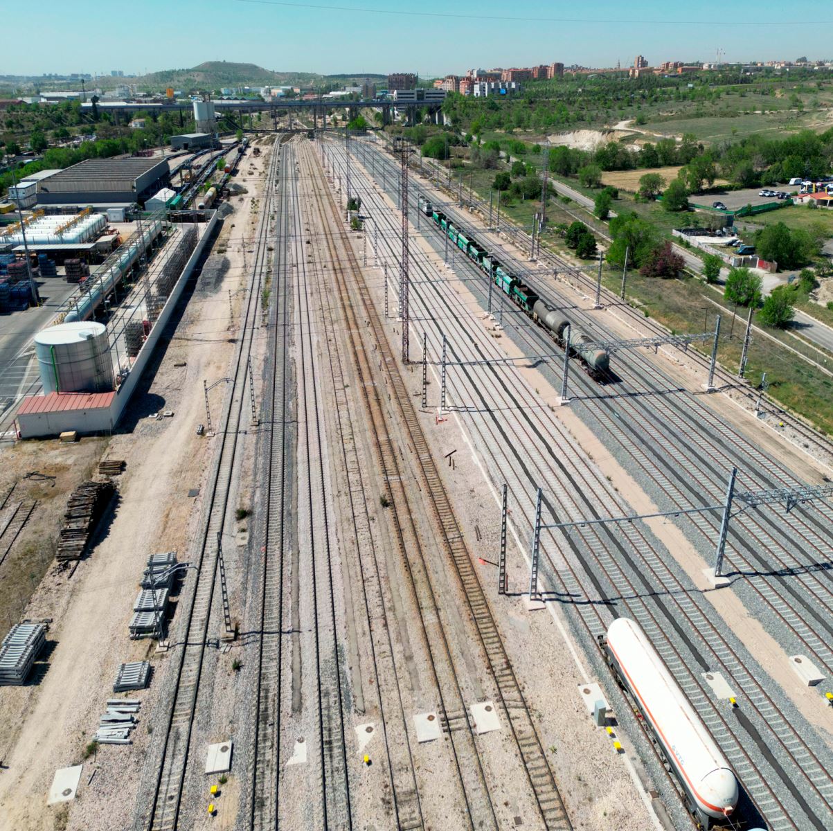 Además, Adif trabaja en la urbanización y los viales de la nueva zona intermodal, con un circuito para el acceso desde una nueva glorieta en la M-214, carga y descarga de los camiones, controles y aparcamiento para vehículos pesados y ligeros.