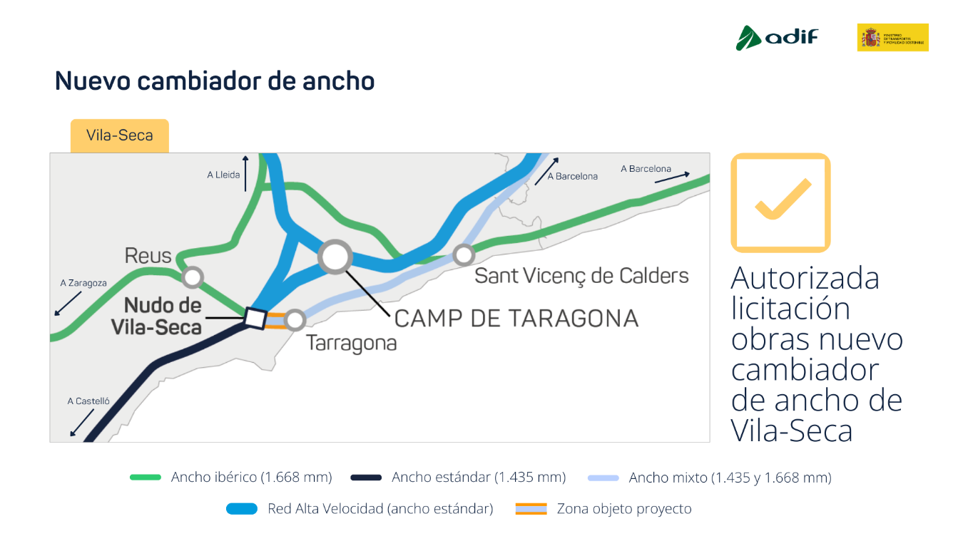 El Consejo de Ministros autorizó ayer al Ministerio de Transportes y Movilidad Sostenible a la licitación de un contrato por 13,22 millones de euros (IVA no incluido), a través de Adif, para completar la instalación del nuevo cambiador de ancho de Vila-seca, en la provincia de Tarragona.