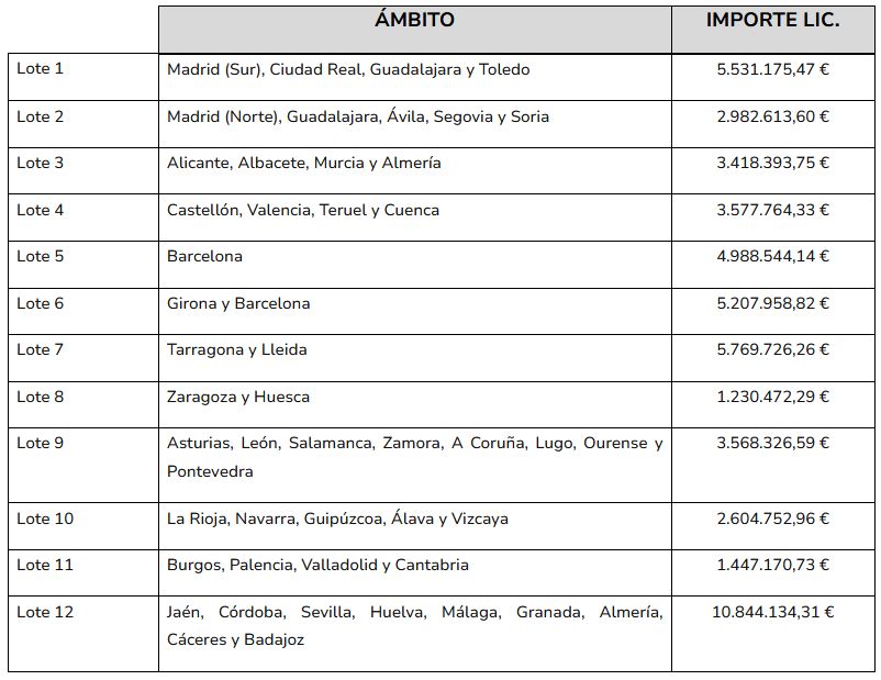 A efectos prácticos, esta licitación ha sido dividida en 12 lotes diferentes, según la situación geográfica.