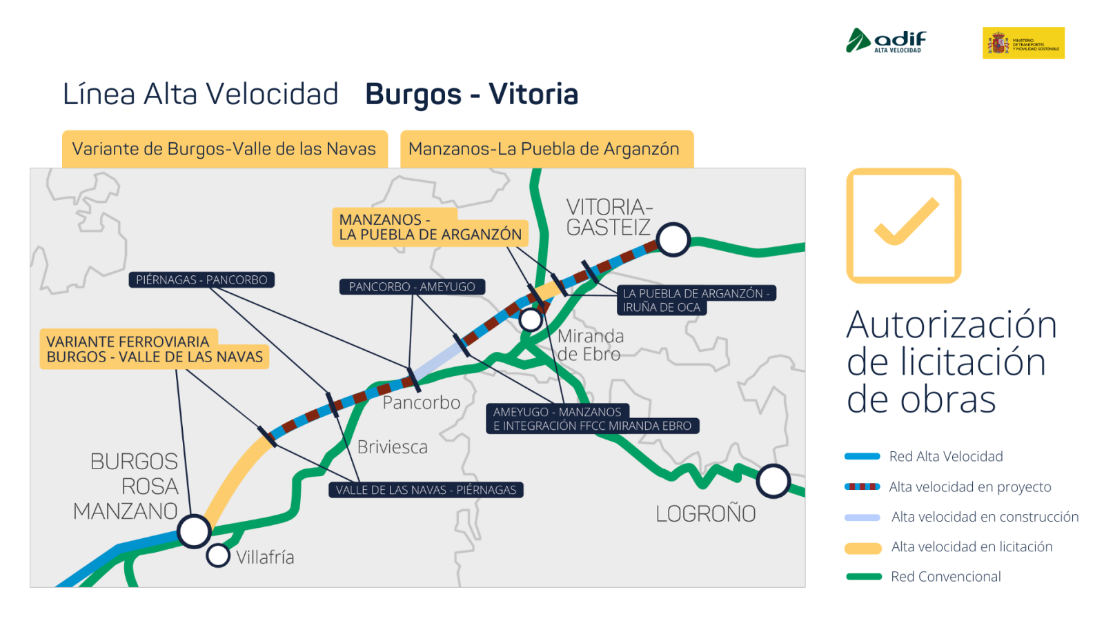 Se trata del tramo comprendido entre la Variante Ferroviaria de Burgos y Valle de las Navas, de 16,7 kilómetros de longitud, que se licita por 159,2 millones de euros, y el Manzanos-La Puebla de Arganzón (7 kilómetros), por 272,4 millones