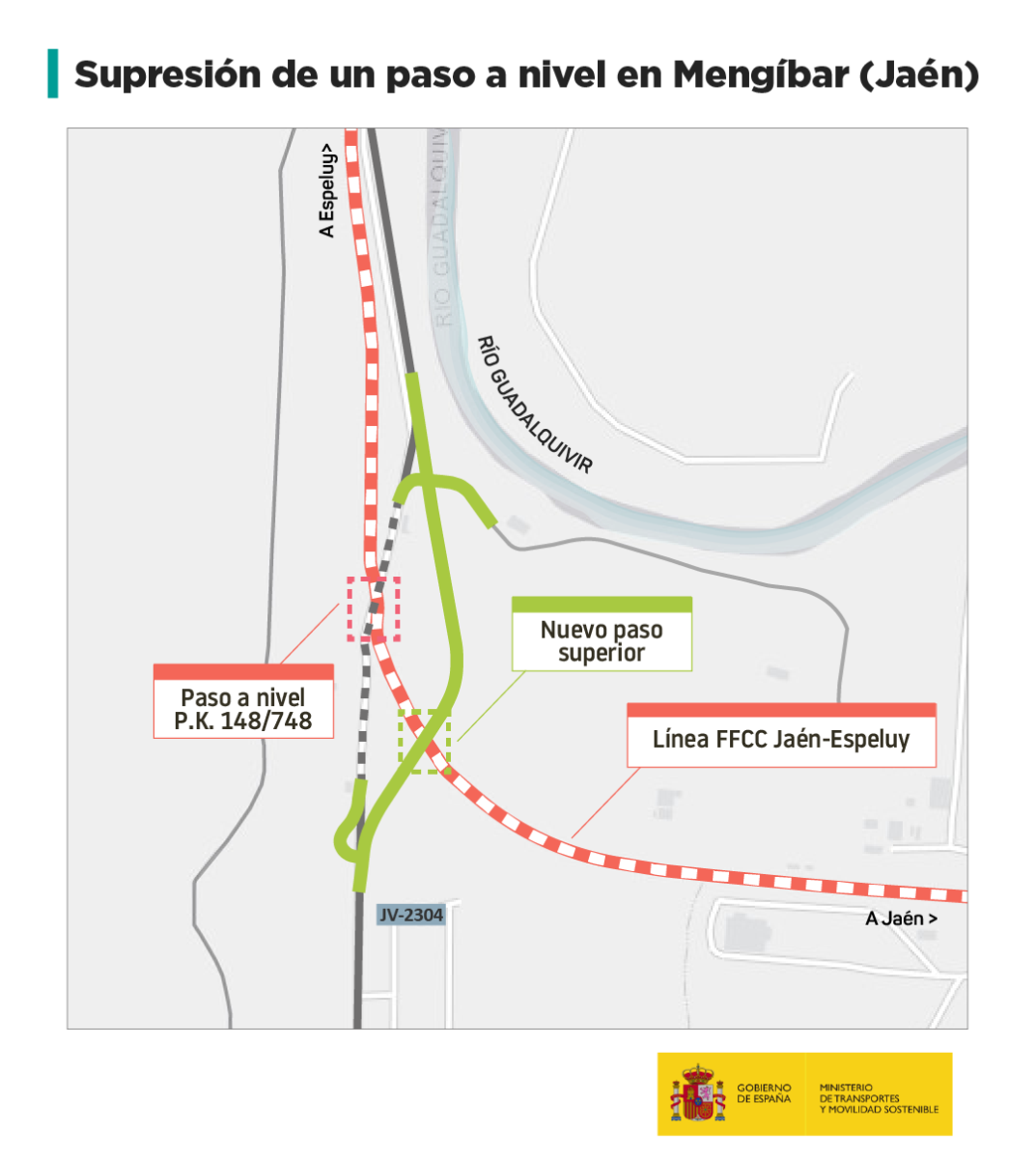 El Ministerio de Transportes y Movilidad Sostenible ha adjudicado, a través de Adif, por un importe de 5 millones de euros, el contrato para la supresión de un paso a nivel de la línea Espeluy-Jaén a su paso por el municipio jienense de Mengíbar, situado cerca del apeadero de Mengíbar-Artichuela.