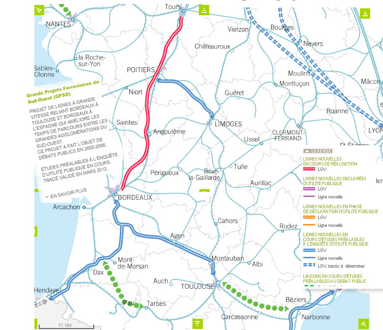 El denominado Grand Proyecto Ferroviario del suroeste (GPSO), que engloba las nuevas líneas entre Burdeos y Toulouse, y Burdeos y la frontera española, que se contemplaba como la prolongación en curso de la línea de alta velocidad Tours–Burdeos con puesta en servicio en 2017, se retrasa sustancialmente.