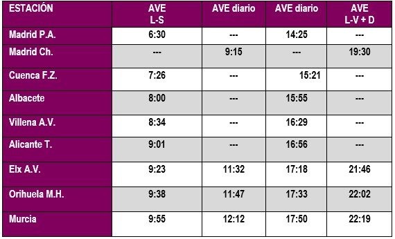 La nueva conexión de alta velocidad entre Madrid y Murcia comenzará el 20 de diciembre. Esta relación se cubrirá con ocho servicios diarios, cuatro por sentido, uno más respecto a la oferta actual de lanzadera y AVE, y una oferta de 2.824 plazas. En cuanto a los tiempos de viaje, esta programación reducirá ados horas y 45 minutos esta conexión, que tendrá origen y destino en la estación Madrid Chamartín Clara Campoamor y paradas intermedias en Orihuela y Elche.