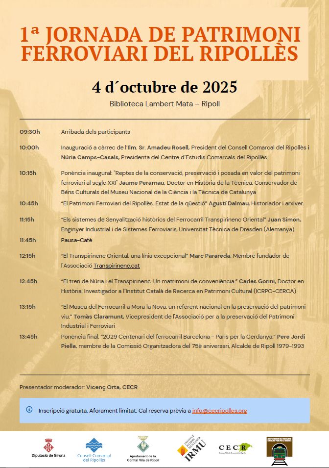 Mañana sábado se celebrará la 1ª Jornada de Patrimonio Ferroviario del Ripollés en la Biblioteca Lambert Mata y en la que participa el Museo del Ferrocarril de Mora la Nova. Comenzará a las 9,30 h hasta las 13,45 h.