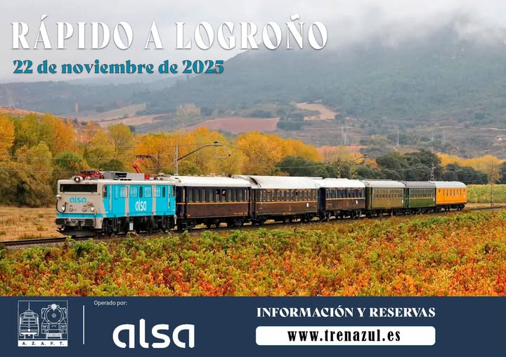 La Asociación Zaragozana de Amigos del Ferrocarril y Tranvías (AZAFT) pone en marcha el viaje “Rápido a Logroño” el sábado 22 de noviembre, a bordo del histórico Tren Azul, operado por Alsa y encabezado por la locomotora 316-003. El tren partirá de Zaragoza-Delicias a las 9:05 y llegará a Logroño a las 11:12, donde los viajeros dispondrán de tiempo libre para recorrer el casco histórico y disfrutar de la oferta cultural y gastronómica de la ciudad.