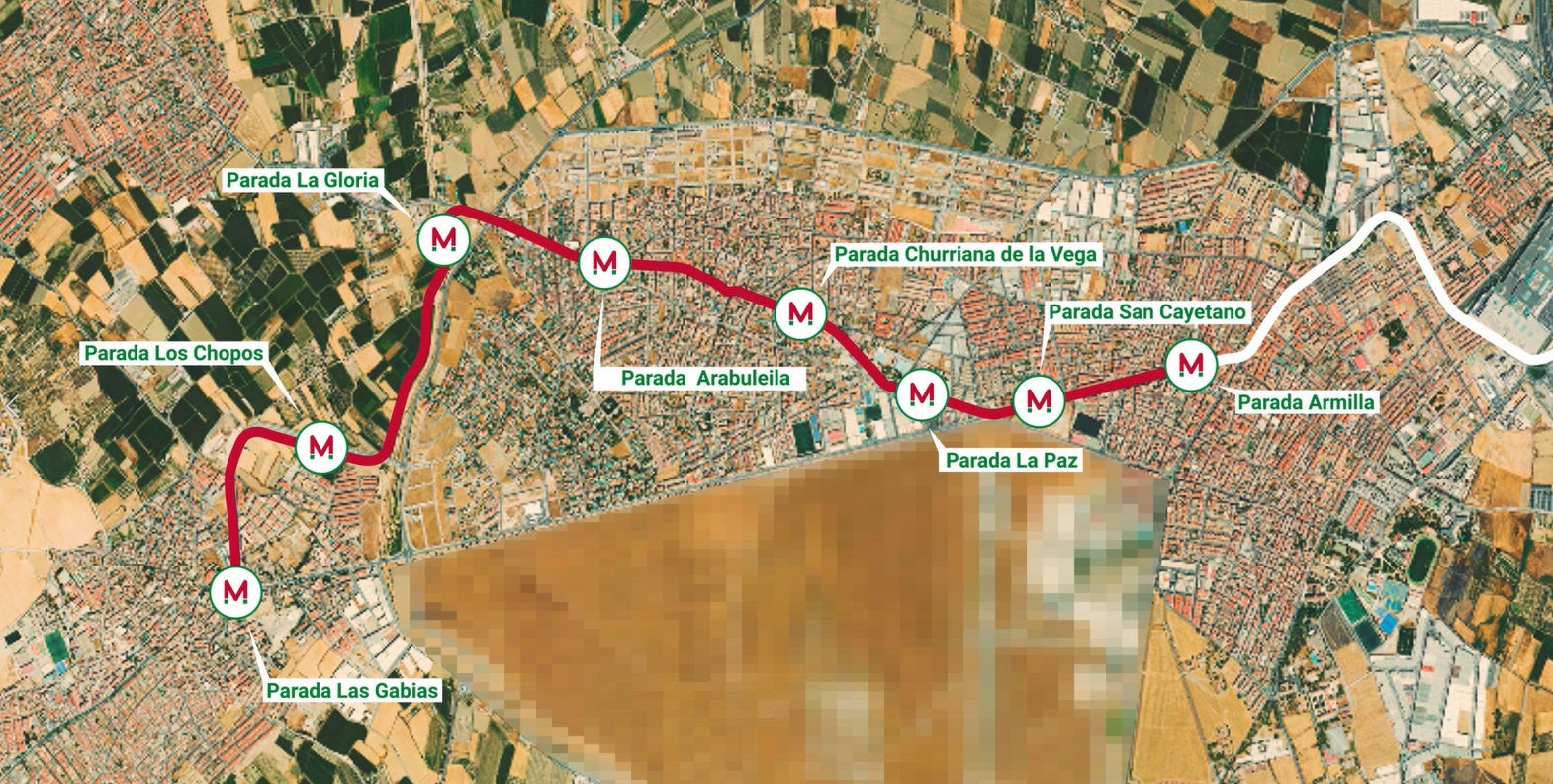 El tramo 2 de la prolongación Sur del Metro de Granada, entre Churriana de la Vega y Las Gabias es el más avanzado, con un grado de ejecución del 87 por ciento. Los trabajos se centran en el intercambiador de La Gloria y en la reurbanización del recorrido en paralelo al río Dílar, por el vial del Machuchón y en el tramo urbano de Las Gabias hasta la Plaza Estación de Tranvías, donde las vías están prácticamente finalizadas.