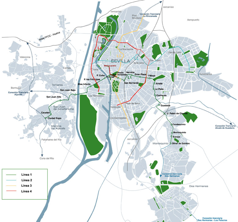 Las líneas 2, 3 y 4 del Metro de Sevilla tienen de una longitud total de 41 kilómetros, con trazado subterráneo en el 80 por ciento de su extensión, según las alternativas preferentes. En este recorrido se incluyen sesenta estaciones y el presupuesto de ejecución previsto asciende a 2.843 millones de euros. Estas tres líneas, sumadas a la Línea 1 en funcionamiento y a sus conexiones tranviarias en Alcalá de Guadaíra y Dos Hermanas, permitirán que más de 700.000 habitantes dispongan de una estación a quinientos metros de su residencia.