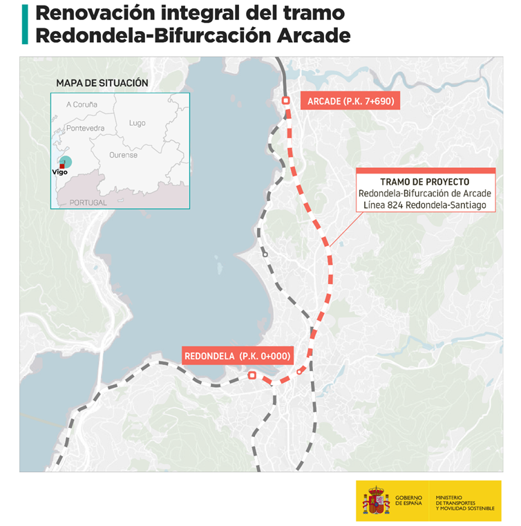 El Ministerio de Transportes y Movilidad Sostenible ha iniciado el procedimiento expropiatorio de los terrenos necesarios para la ejecución de las obras del proyecto de renovación integral del tramo Redondela – Bifurcación Arcade, perteneciente a la línea convencional Redondela – Santiago de Compostela, en los términos municipales de Redondela y Sotomayor, en Pontevedra.