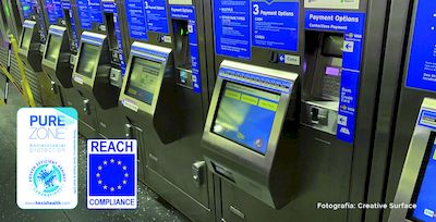 Films antimicrobianos que permiten proteger todas las superficies de contacto frecuente: botoneras, pantallas táctiles, mesas, reposabrazos, mostradores, zonas habilitadas para el equipaje, servicios de restauración, aseos...