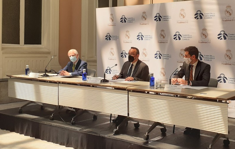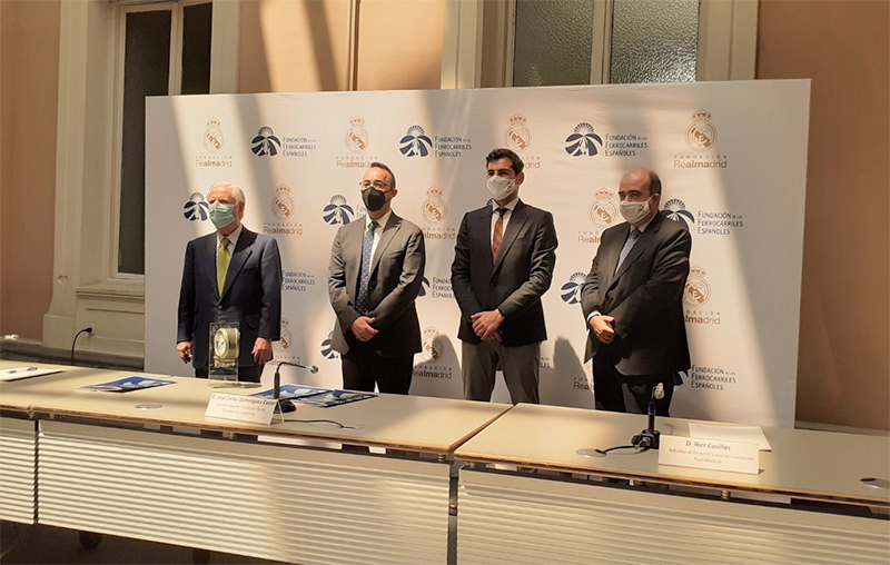 El vicepresidente ejecutivo de la Fundación Real Madrid, Enrique Sánchez, y el director gerente de la Fundación de los Ferrocarriles Españoles, José Carlos Domínguez Curiel firmaron el acuerdo en un acto en el que estuvieron presentes el director gerente de la Fundación Real Madrid, Julio González Ronco, y el adjunto al director general de la entidad, Iker Casillas.