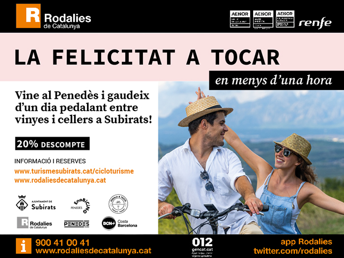 Renfe ofrece descuentos para viajar al Penedés a aquellos viajeros que se acerquen a la estación de Lavern-Subirats presentando el billete válido del día y así poder beneficiarse del 20 por ciento de descuento en la ruta en bicicleta eléctrica pedaleando entre viñedos y una cata en una de las bodegas de esta comarca vitivinícola. Los usuarios interesados deberán reservar la actividad previamente en  Enobicing Penedès en el teléfono 656 908 590 o enviando un mail pinchando aquí+info