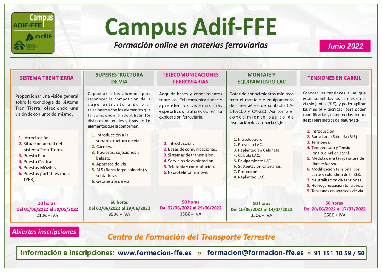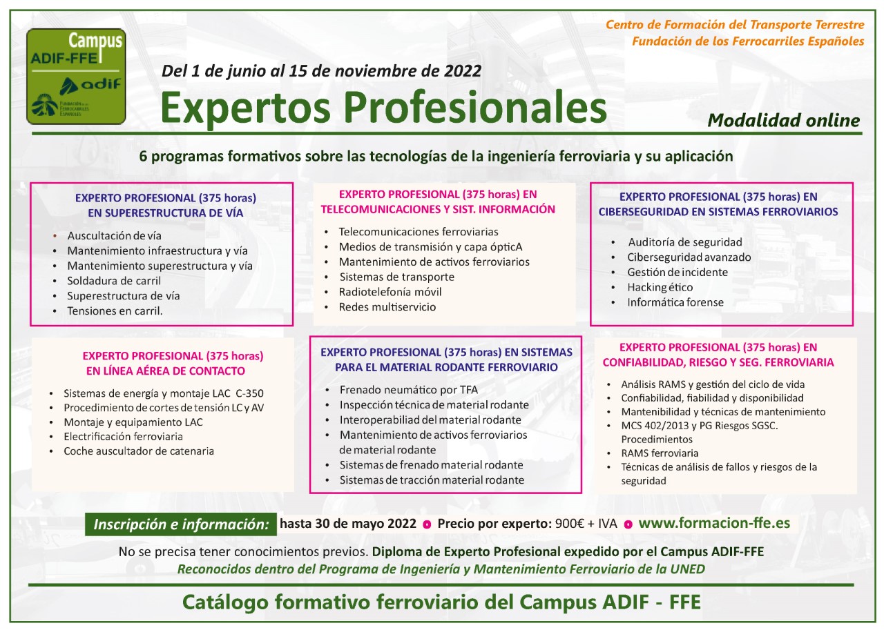 El Campus ofrece también seis programas expertos profesionales en modalidad online sobre las tecnologías de la ingeniería ferroviaria y su aplicación. Los programas tienen una duración de 375 horas cada uno, desde el 1 de junio al 15 de noviembre de 2022, y la fecha tope para matricularse en ellos es el próximo 30 de mayo.