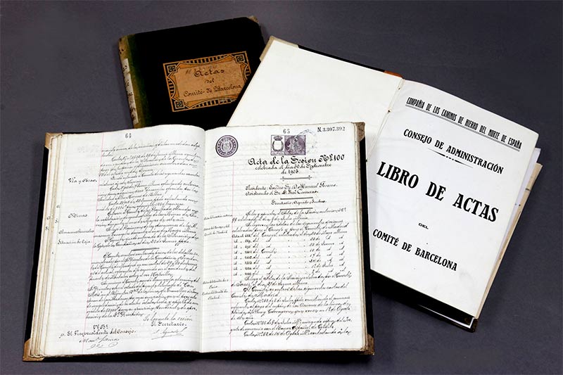 Los libros de actas son documentos contables que, según establece la legislación, deben confeccionar obligatoriamente las sociedades mercantiles desde el momento de su constitución y a lo largo de toda su existencia para registrar en ellos las actas de las sesiones de sus órganos colegiados (consejos de administración, comités, comisiones, juntas, asambleas de accionistas…), en las que se recogía todo lo tratado y acordado en las diferentes reuniones. Las compañías ferroviarias citadas generaron libros de actas que proporcionan información directa, diversa y de notable interés para investigar su actividad. Esta nueva sección, de contenido tan relevante, continuará ampliándose en el futuro con nuevas digitalizaciones.