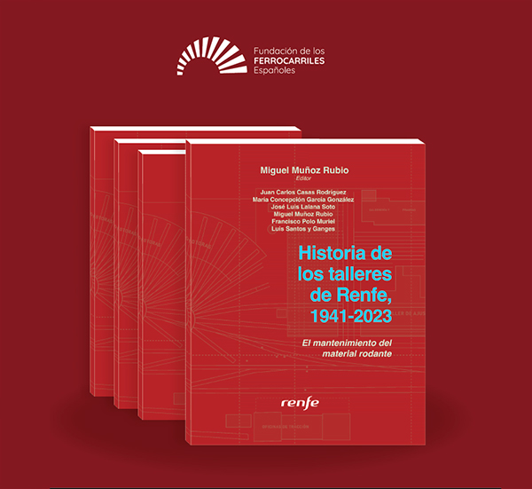 Y más libros… El martes 23 de abril a las 13:00 horas se presentará en el Palacio de Fernán Núñez la monografía ‘Historia de los talleres de Renfe, 1941-2023. El mantenimiento del material rodante’, un recorrido por la historia de estas instalaciones técnicas, parte esencial de la historia del ferrocarril en España. Editado por Renfe y la Fundación, es una obra colectiva cuyos autores son Miguel Muñoz Rubio, Juan Carlos Casas Rodríguez, María Concepción García González, José Luis Lalana Soto, Francisco Polo Muriel y Luis Santos y Ganges.