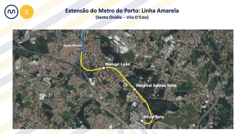 La ampliación de la línea amarilla del metro de Oporto se extiende desde Santo Ovídio hasta Vila d'Este, en la zona sur de Oporto, añadiendo tres nuevas estaciones, una de ellas subterránea. El nuevo trazado, de 3,1 kilómetros, incluye quinientos metros de viaducto y un túnel de un kilómetro. Está previsto que entre en servicio en el primer semestre de 2024.
