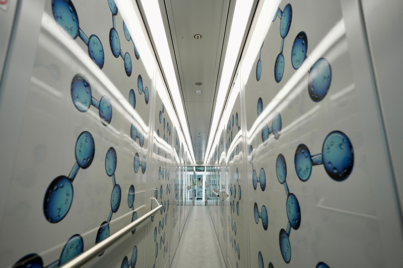 El coche intermedio, denominado ‘Power Car’, equipa los sistemas de propulsion de hidrógeno. La energía se suministra combinando el hidrógeno almacenado en depósitos con oxígeno del aire exterior, una operación que no emite dióxido de carbono a la atmósfera. Unas baterías de iones de litio de alto rendimiento almacenan la energía, que se utiliza posteriormente durante las fases de aceleración para apoyar la acción de las pilas de combustible de hidrógeno y garantizar el ahorro de combustible.