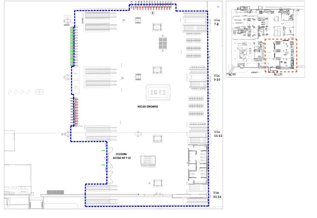 Con esta distribución, funcionan dos núcleos de salida y uno de entrada para los servicios de Cercanías y Media Distancia y se eliminan los actuales controles de acceso diferenciados a las vías 13 y 14, modificándose además la zona de entrada para los trenes de Larga Distancia que circulan por vías de ancho convencional.