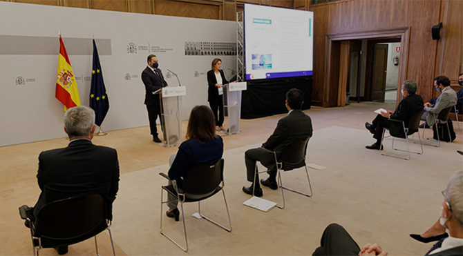 El ministro de Transportes, Movilidad y Agenda Urbana, José Luis Ábalos, y la vicepresidenta cuarta y ministra para la Transición Ecológica y el Reto Demográfico, Teresa Ribera, presentaron ayer la agenda de inversiones y reformas estructurales previstas en el marco del Plan de Recuperación, Transformación y Resiliencia enviado a la Comisión Europea, cuyo objetivo es avanzar hacia una España más verde, más digital, más cohesionada e igualitaria. (Ver documento presentación Plan de Recuperación, Transformación y Resiliencia).