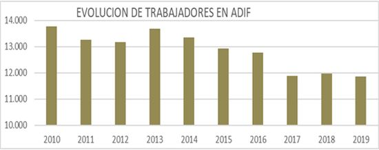 La plantilla de Adif y Adif Alta Velocidad es actualmente de unas 11.500 personas, con una media de edad elevada (54 años). En estos últimos años se ha producido un alto número de jubilaciones y este ritmo se mantendrá en los próximos ejercicios, ya que casi el 80 por ciento de la plantilla tiene cincuenta años o más.