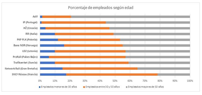 La necesidad de ampliar y rejuvenecer la plantilla es aún más acuciante si comparamos la situación con la de otros administradores de infraestructuras ferroviarias europeos, en términos de número de trabajadores, y estructura de la plantilla por edad.