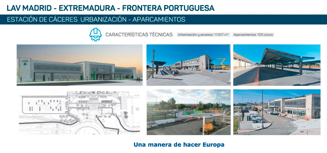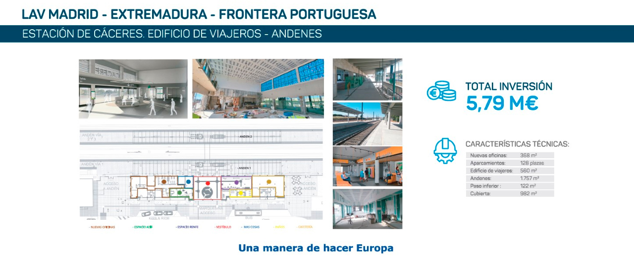 (03/06/2021) Las obras en ejecución contemplan la remodelación e integración sostenible de la terminal cacereña, dentro del ámbito de las nuevas estaciones de alta velocidad pertenecientes a la línea de alta velocidad Madrid-Extremadura, para dotarla de todas las características y servicios necesarios para albergar la alta velocidad ferroviaria, incluida la electrificación. En estos momentos se desarrollan actuaciones similares en las estaciones de Plasencia, Badajoz y Mérida, por un importe superior a los 17,10 millones euros.