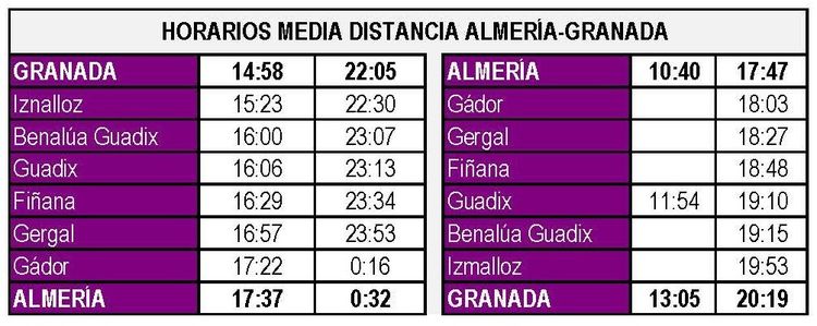 Los trenes con origen o destino en la estación de Almería suprimen el trasbordo entre ésta y la de Huércal, recuperando sus horarios habituales. Así, los cuatro trenes diarios Media Distancia entre Almería y Granada tendrán desde hoy los siguientes horarios: