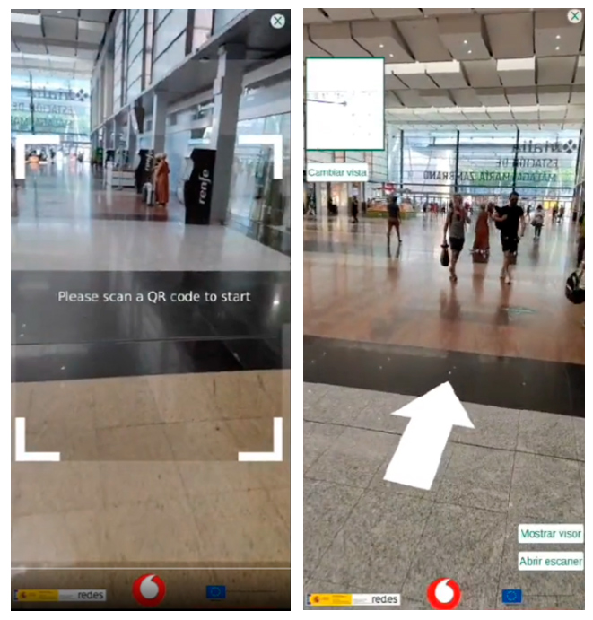 - La aplicación de guiado al viajero, que ofrece al usuario acceso al modelo BIM 3D de la estación y lo guía hacia el punto de destino superponiendo una flecha virtual sobre la imagen real de la cámara del dispositivo, indicándole la dirección que debe seguir para alcanzar el destino. (Ver vídeo)