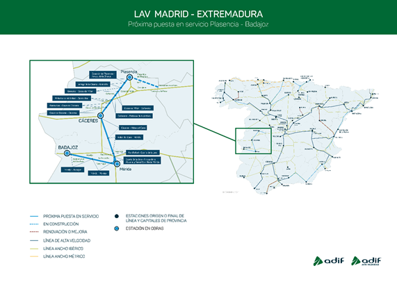(16/12/2021) El contrato tiene un valor estimado de 39.968.882 euros (IVA no incluido) y una duración de cuatro años y tiene como objetivo garantizar el perfecto estado de conservación y funcionalidad de los sistemas de infraestructura, vía y aparatos de vía de la línea de alta velocidad Plasencia-Badajoz.