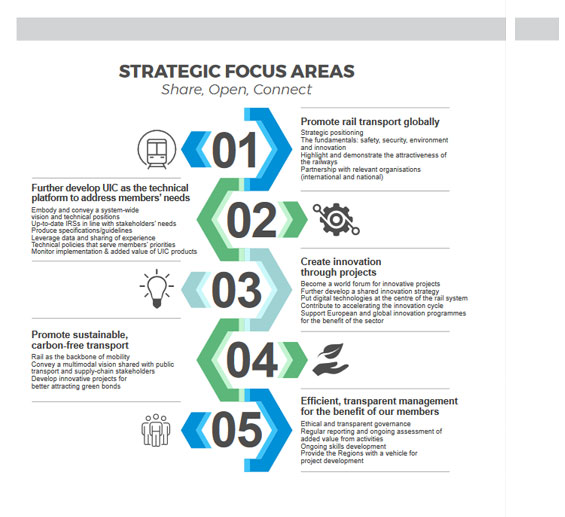 El documento está organizado estratégicamente en torno a las áreas de trabajo que la organización abordará durante los tres próximos años, entre ellas la promoción global del ferrocarril como medio de transporte sostenible y sin emisiones de carbono; los fundamentos de seguridad y protección; el desarrollo de la digitalización conjunta del sistema; la consolidación del transporte ferroviario como columna vertebral de la cadena logística mundial; el ferrocarril como medio prioritario de transporte de viajeros y la gestión transparente y eficiente.