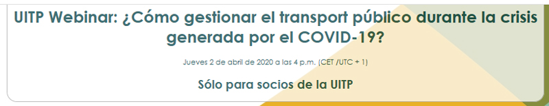 Este “webinar”, de una hora de duración, gratuito y sólo disponible para los socios de la UITP, abordará cuestiones como los principios generales para el control de pandemias, la gestión por fases y ejemplos de medidas adoptadas en distintas partes del mundo.