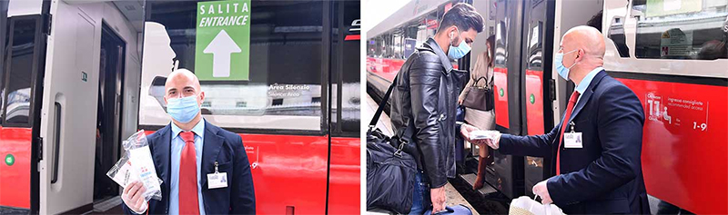 Trenitalia ofrece a sus viajeros de alta velocidad, un kit gratuito de seguridad compuesto por mascarilla, gel hidroalcohólico, guantes de látex de un solo uso y reposacabezas desechable para el asiento.
