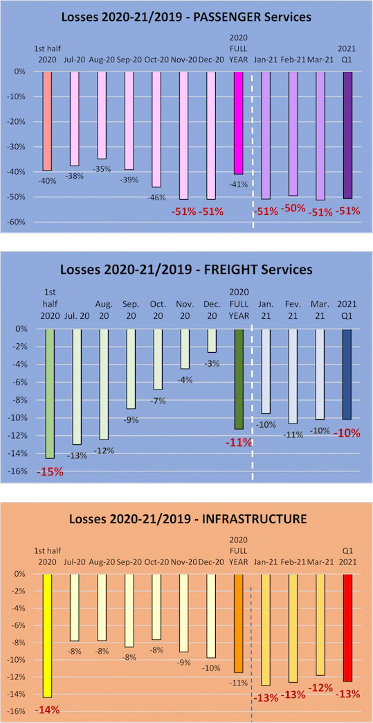 Los administradores de infraestructura también han aumentado sus pérdidas que han pasado deuna caída del 8 por ciento, en el verano de 2020, a 13 por ciento, en el primer trimestre de este año. estas cifras en infraestructura, recopiladas por primera vez en  la encuesta de CER, exigen un apoyo específico a los ferrocarriles para mitigar el impacto negativo del Covid-19, urgente e indispensable para la recuperación y el crecimiento futuro del sector.