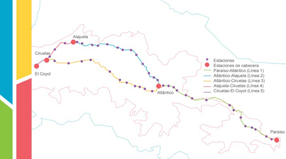 El trayecto ampliará el trazado ferroviario actual y llegará hasta Coyol y Ciruelas de Alajuela, en el oeste, y Paraíso de Cartago en el este. Estará dividido en cinco líneas: la línea 1, Paraíso-Atlántico; línea 2, Atlántico-Alajuela, y línea 3, Atlántico-Ciruelas, operarán de forma independiente, mientras que las líneas 4, Alajuela-Ciruelas, y 5, Ciruelas-El Coyol, se plantean como extensiones de las líneas 2 y 3 respectivamente. Además, contará con una gran estación central denominada del Atlántico.