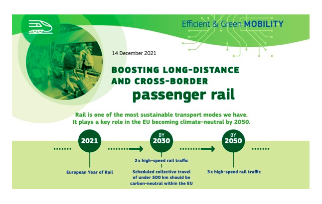 Las propuestas van acompañadas de un plan de acción sobre el ferrocarril de larga distancia y transfronterizo que establece nuevas acciones para ayudar a la Unión a cumplir su objetivo de duplicar el tráfico ferroviario de alta velocidad para 2030 y triplicarlo para 2050. El Plan de Acción establece acciones concretas para eliminar las barreras a los viajes transfronterizos y de larga distancia, y hacer que los viajes en tren sean más atractivos para los viajeros.