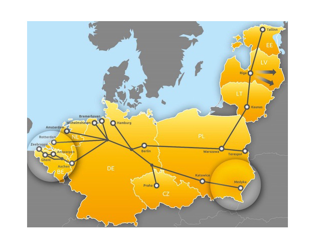 El corredor ferroviario de mercancías Mar del Norte - Báltico, RFC NS-B, se ha ampliado hasta Medyka, en Polonia, y los puertos de Gante y Zeebrugge, en Bélgica, como línea principal y hasta el puerto de Terneuzen, en los Países Bajos, como línea de conexión.