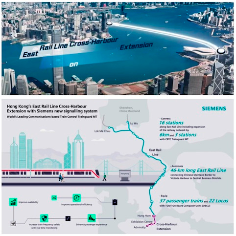 (24/05/2022) La línea East Rail Line con la nueva exyensión Cross-Harbour suma dieciséis estaciones y 46 kilómetros que dan conexión a los centros comerciales, financieros y de convenciones en las áreas de Wan Chai North y Admiralty. Equipada con el CBTC de Siemens Mobility en sus ofrece mayor capacidad dy permite actualizaciones continuas para adaptarse a las exigencias de la operación.