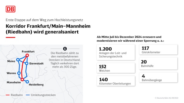 Los Ferrocarriles Alemanes, DB, renovarán completamente la línea Frankfurt-Mannheim. En julio de 2024, comenzarán las renovaciones en la llamada Riedbahn, entre Frankfurt y Mannheim para mejorar la calidad y la puntualidad del servicio y actuakizar la línea para los próximos años.