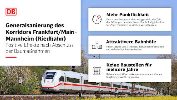 Un equipo de coordinación permitirá que los trabajos se ejecuten a una velocidad récord para que finalicen en solo cinco meses, DB renovará todos los sistemas y modernizará veinte estaciones a lo largo de la línea. Con esta remodelación se cubrirán todos los trabajos de actualización planificados para los próximos años. Una vez que se complete el trabajo, mejorará la puntualidad, se reduciurán las interrupciones y se ofrecerán más opciones de viaje para viajeros y mercancías, además de eliminarse restricciones entre Frankfurt y Mannheim ya no serán necesarias durante muchos años.