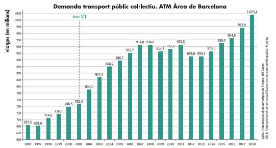 Durante el pasado 2018, el sistema de transporte público en el ámbito de la ATM de Barcelona alcanzó la cifra de 1.025,4 millones de viajes frente al año anterior, récord hasta ahora, que se cerró con 985,9 millones de viajes. Esos1.025,4 millones de viajes representan un aumento de más de 39,5 millones de viajes en el conjunto del sistema respecto al 2017, lo que significa un incremento del 4 por ciento.