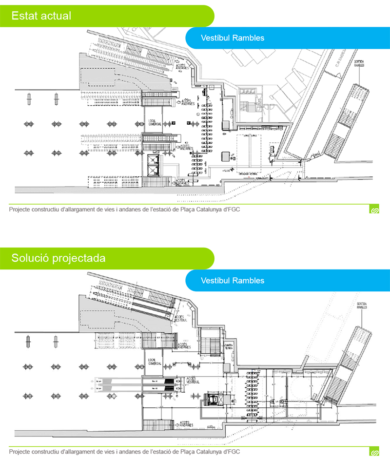 En una primera fase se alargarán las vías 1 y 2 junto a Ramblas, con andenes y nuevos topes, se derribarán las escaleras actuales de acceso al andén en la entrevía 1-2 y se ejecutarán dos nuevas escaleras mecánicas para sustituirlas. A continuación, se ampliará el vestíbulo de entrada junto a Ramblas y se trasladarán las barreras tarifarias y las máquinas de venta de billetes desde de su posición actual al nuevo vestíbulo.