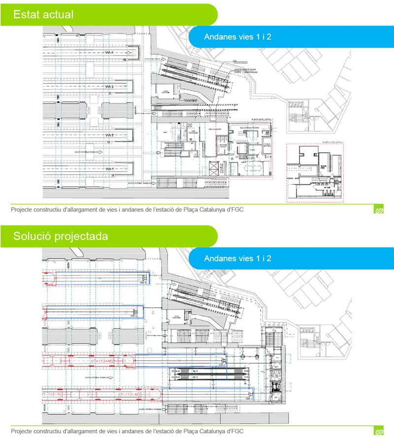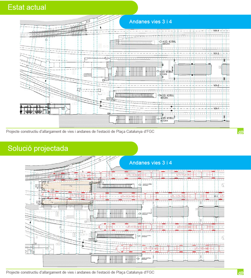 En Plaza Catalunya, la principal estación de la línea, con 13 millones de validaciones anuales, se alargarán las vías actuales hasta conseguir una distancia de 21,90 metros desde el punto de estacionamiento hasta los topes, en las vías 1, 2, 3 y 4.