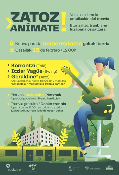 El próximo día 15 de febrero tendrá lugar la puesta en servicio de la ampliación del tranvía de Vitoria a la universidad. Al acto institucional, previsto en la primera parada, Florida, le seguirá un amplio programa festivo.