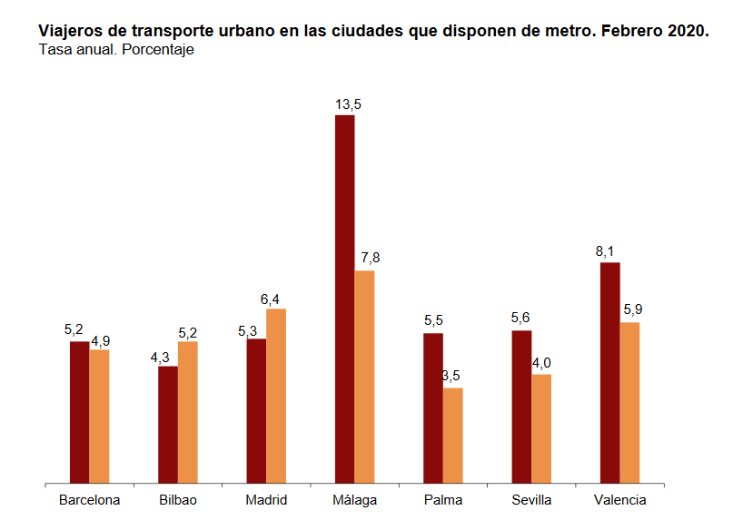 El metropolitano que experimentó un mayor crecimiento en febrero fue el de Málaga, con un 13,5 por ciento más de viajeros que en el mismo mes de 2019, seguido del de Valencia, con un 8,1 por ciento más de usuarios, Sevilla, con un 5,6 por ciento más, Palma, con un incremento del 5,5, Madrid, con un 5,3 y los de Bilbao y Barcelona, con incrementos respectivos del 5,2 por ciento.
